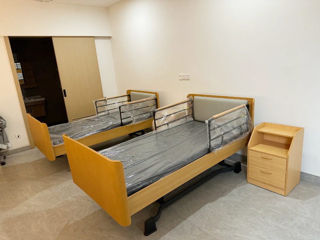 梦泊科技此次为眉寿康福护理院提供的是三电机四功能电动床、两电机三功能电动床、1.2米居家款电动床。